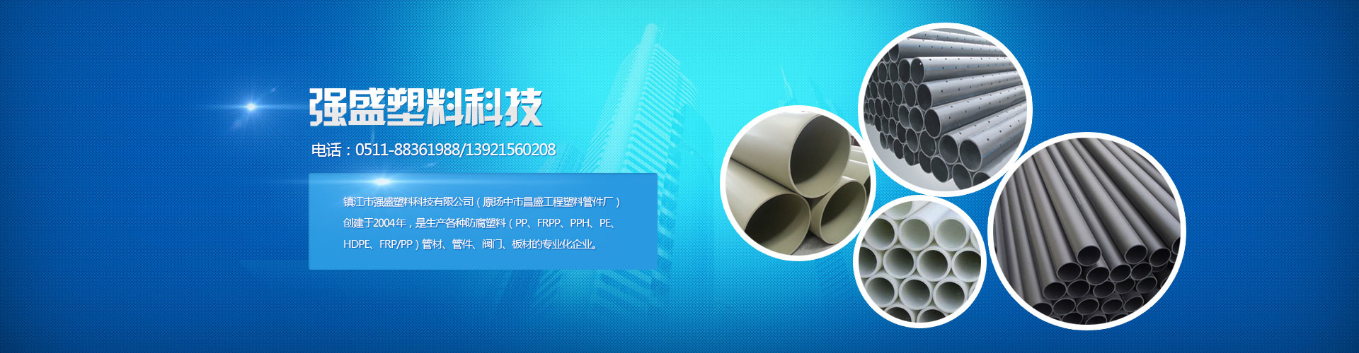 鎮(zhèn)江市強盛塑料科技有限公司(原揚中市昌盛工程塑料管件廠)創(chuàng)建于2004年,是生產(chǎn)各種防腐塑料(PP、FRPP、PPH、PE、HDPE、FRP/PP)管材、管件、閥門、板材的專業(yè)化企業(yè)。公司擁有各類先進生產(chǎn)設備,固定資產(chǎn)約3800萬元,可生產(chǎn)管材、管件口徑為Φ15-Φ1200mm,產(chǎn)品規(guī)格齊全。目前產(chǎn)品廣泛適用于醫(yī)藥、食品、冶金、造紙、電力、礦山、城市污水處理、垃圾填埋、輕工紡織等領域,暢銷全國各省市自治區(qū),遠銷二十多個國家及地區(qū)。